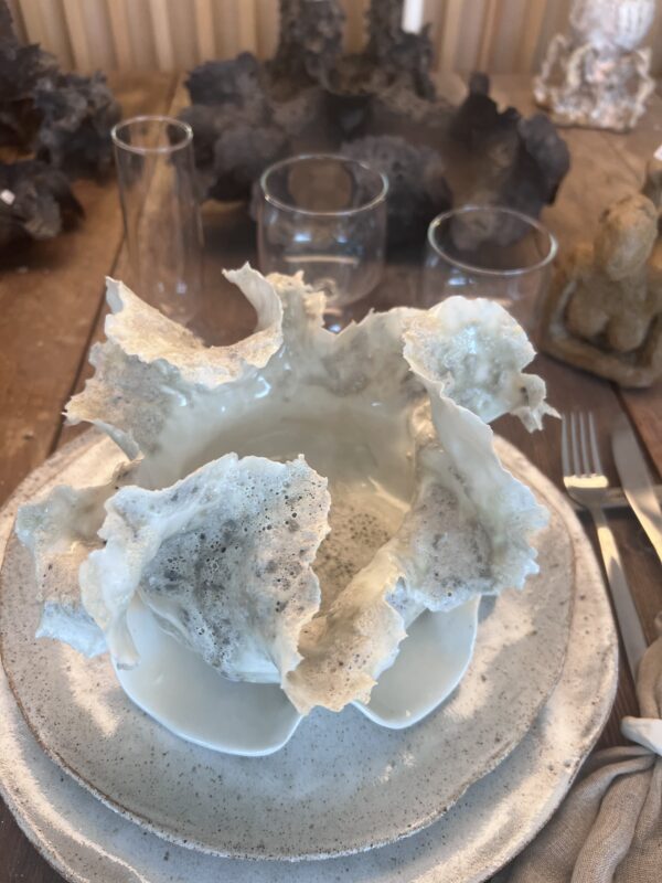 Vælg skulptur skåle med “koralrev/havskum”, hvis du vil have en skål, der også fungerer som objekt på spisebordet eller i vindueskarmen. Den abstrakte skål med lava giver en taktil, mineralsk overflade, der spiller flot med linnedduge og træ. Til daglig brug er de klassiske porcelæns skåle og sæt á tre geniale til snacks, dip og tapas – og de kan nemt kombineres med dine tallerkener og kopper fra samme univers. Skal der dækkes op til mange, er den store salatskål robust og rummelig, mens modellerne i organisk stil og vintage look tilfører bløde kanter og et mere boheme præg. Kort sagt: du kan bygge alt fra et stramt, nordisk setup til en mere kunstnerisk, lag-på-lag borddækning.